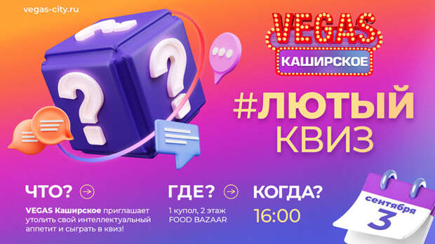 3 сентября в зоне Food Bazaar в VEGAS Каширское в 16:00 пройдет игра «ЛютыйКвиз» – веселое интеллектуальное соревнование в командах.