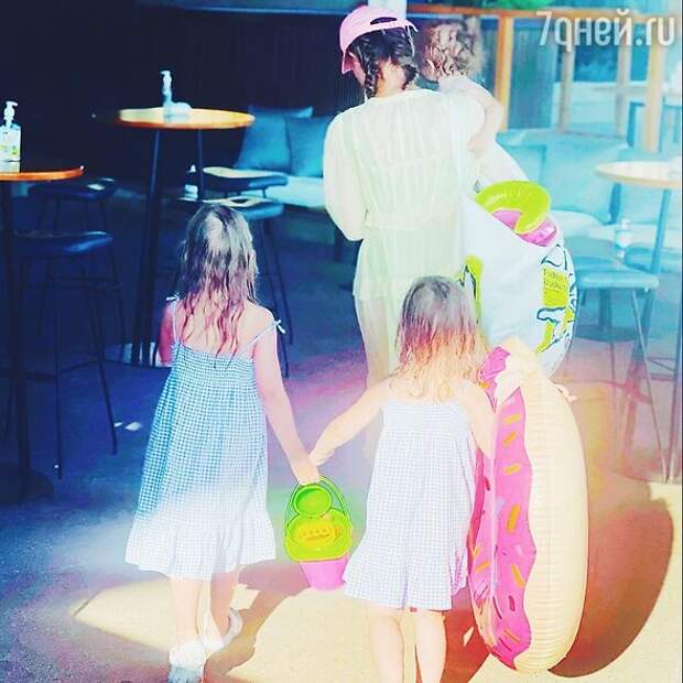 На снимке счастливая многодетная мама идет со своими детьми с пляжа. Актриса пошутила, что её каникулы далеки от глянцевых картинок в модных журналах. Накануне она взяла перерыв в материнских обязанностях и устроила красивую фотосессию в купальнике у бассейна, но потом призналась: