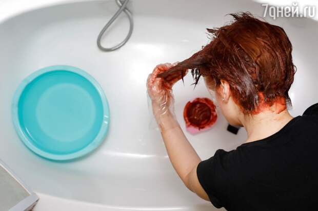 После того как корни прокрашены, пройдитесь кистью горизонтально вдоль линии лба и по вискам. В окраске волос затылочной части головы поможет маленькое зеркало.Если хотите, чтобы краска лучше впиталась, и боитесь испортить паркет или ковер (краску сложно удалить), используйте полиэтиленовую шапочку для душа. А вот заматывать голову пищевой пленкой и греть феном — это совершенно лишнее.