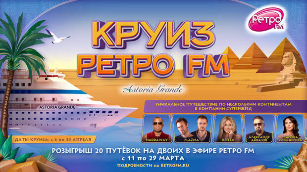 Стали известны имена звёздных участников «Круиза Ретро FM 2024». Компанию всем пассажирам в незабываемом путешествии на современном лайнере Astoria Grande составят культовые иностранные и отечественные звёзды — Haddaway, Plazma, Reflex, Марина Хлебникова и Александр Айвазов.