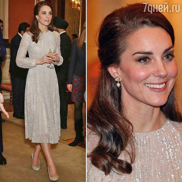 Принц Уильям и его супруга посетили торжественный вечер в честь крепкой дружбы Соединенного Королевства Великобритании и Индии. Для этого мероприятия Кейт выбрала расшитое пайетками недлинное платье от своего любимого бренда Erdem и блестящие туфли в тон наряду от Oscar de la Renta. Любопытно, что хотя герцогиня Кембриджская не надела наряд с декольте или с кринолином, тем не менее в прессе написали, что выглядела она в тот вечер как настоящая принцесса.