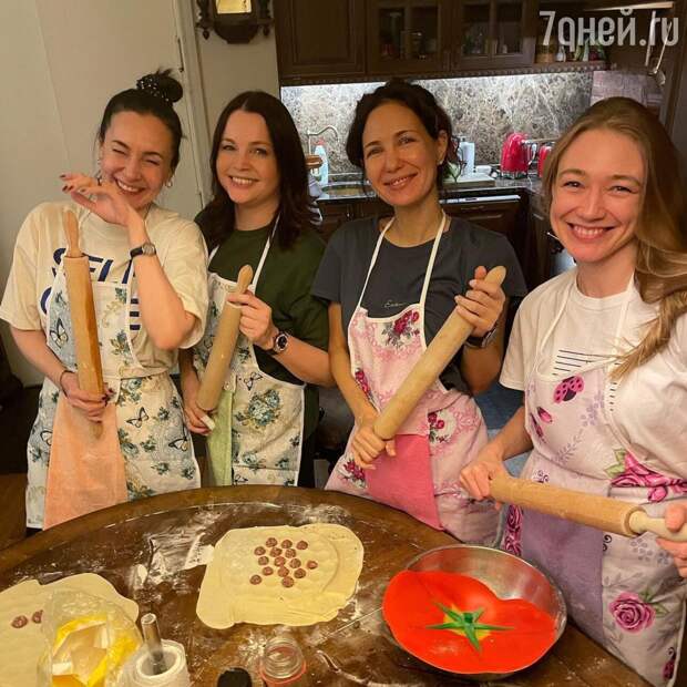 На днях актрисы воспользовались небольшой паузой в работе и организовали домашнюю вечеринку. В Сети появилось фото, сделанное в разгар встречи. На нем звезды кино позируют в фартуках на кухне рядом с заготовками для вкусного ужина.