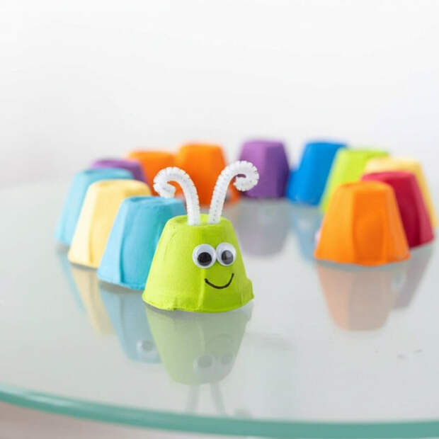 Вырежьте несколько ячеек из лотка для яиц, покрасьте каждую в яркие цвета. Соедините друг с другом с помощью клея так, как показано на картинке. Добавьте глазки и рожки.