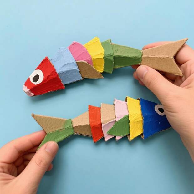 Вырежьте 7 ячеек из лотка для яиц, покрасьте каждую в яркие цвета. Соедините друг с другом с помощью клея так, как показано на картинке. Добавьте плавник и глазки. Вуаля, ваша рыбка готова!