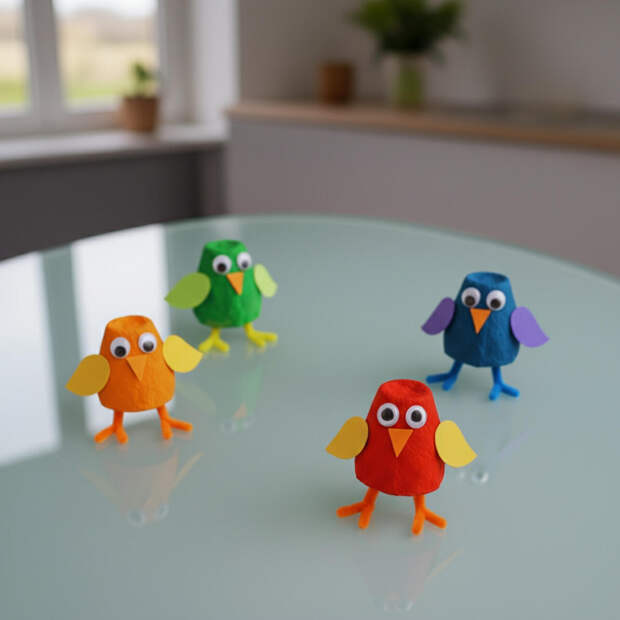 Вырежьте одну ячейку из лотка для яиц, перекрасьте ее в свой любимый цвет. Из цветного картона вырежьте нос и крылышки. Доклейте глазки, как показано на картинке. Их можно приобрести в любом магазине для рукоделия или на маркетплейсе.