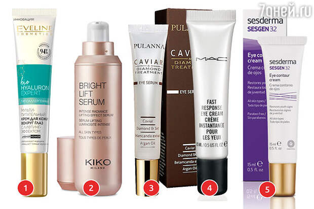 1. Мультипитательный крем для кожи вокруг глаз с лифтинг-эффектом BioHYALURON Expert Eveline Cosmetics. 2. Сыворотка для кожи вокруг глаз Bright Lift Serum Kiko Milano. 3. Восстанавливающая лифтинг-сыворотка для кожи вокруг глаз Pulanna. 4. Крем для глаз Fast Responce M.A.C. 5. Контур-крем для зоны вокруг глаз для коррекции морщин Sesgen32 Sesderma.