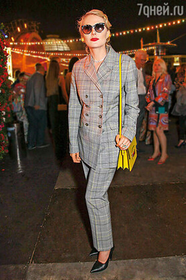 «Серый клетчатый костюм — более деловой, скорее офисный. Но вместе с тем образ тоже получился стильный благодаря двум рядам пуговиц на жакете и этой желтой сумке. Серое с желтым — самое модное сочетание весны-лета — 2021. Дамы, возьмите это на заметку. И обратите внимание!Несмотря на то что Рената находится в определенном возрасте, ей уже исполнилось 50 лет, она очень бодра, моложава, стройна. Она не только в хорошей форме, но и сохраняет сексуальную привлекательность. А это, согласитесь, большое достижение».