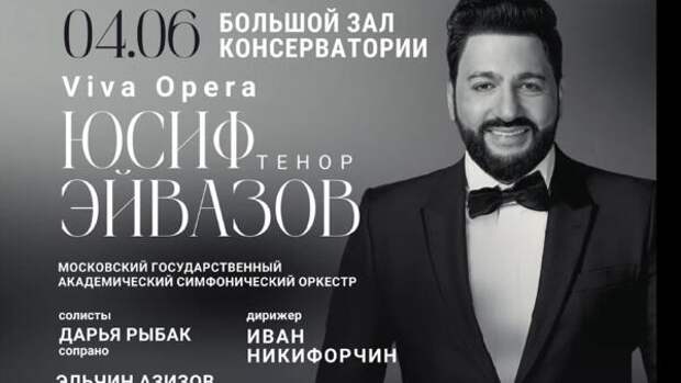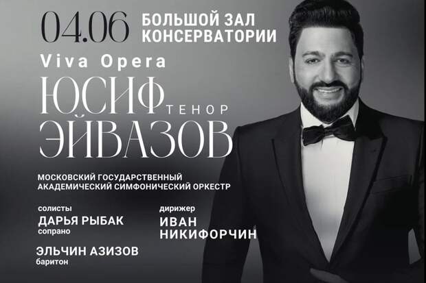 4 июня в Большом зале Московской консерватории состоится праздничный гала-концерт «Viva opera», посвященный шедеврам русской и зарубежной музыки. В исполнении известного тенора Юсифа Эйвазова прозвучат знаменитые арии из опер Петра Ильича Чайковского, Джузеппе Верди, Джакомо Пуччини, Руджеро Леонкавалло и других композиторов.