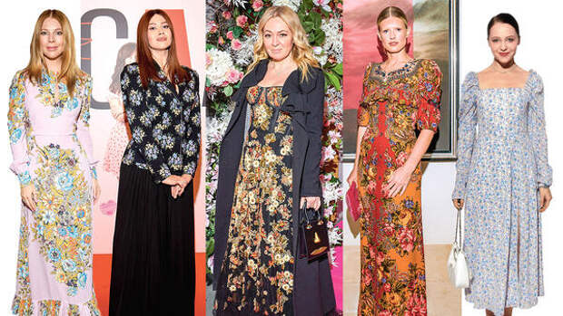 В первую очередь обратите внимание на красивые, изящные, женственные платья и комплекты из юбок и блуз с типичными, очень узнаваемыми цветочными принтами с русскими мотивами.