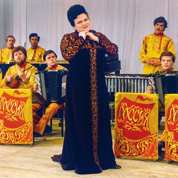 Легендарные певицы Людмила Зыкина и Ольга Воронец считались иконами русского стиля на советской эстраде. Они почти всегда выступали в стилизованных народных костюмах — платьях и сарафанах с традиционными орнаментами и вышивками, использовали и павловопосадские платки с цветочными узорами.