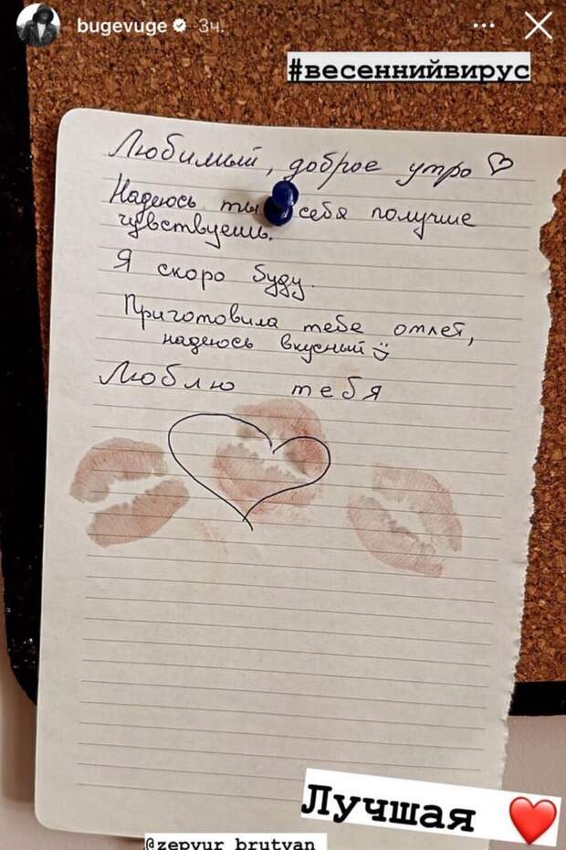 Он сообщил, что его сразил весенний вирус, поэтому он остается дома, а Брутян вынуждена о нем заботиться. В доказательство артист опубликовал фото милой записки, оставленной супругой.Статьи по теме: