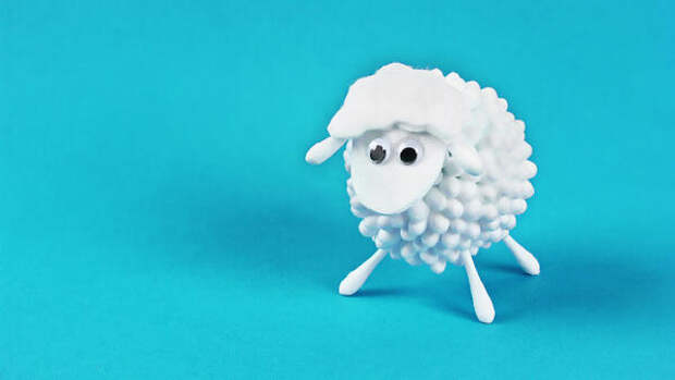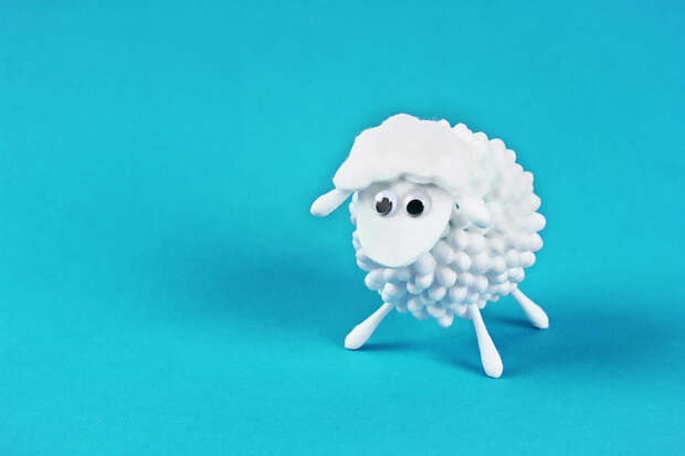 Для начала слепите из пластилина или теста небольшой шарик, это будет заготовка для головы овечки. Из второго куска пластичной массы слепите бочонок, это будет заготовка для тела овечки, соедините вместе обе части. Разрежьте ватные палочки пополам и втыкайте их в заготовку близко друг к другу, чтобы все тело будущей овечки было плотно заполнено палочками. У четырех палочек снимите вату с одного из концов и вставьте их в заготовку на месте ножек.
