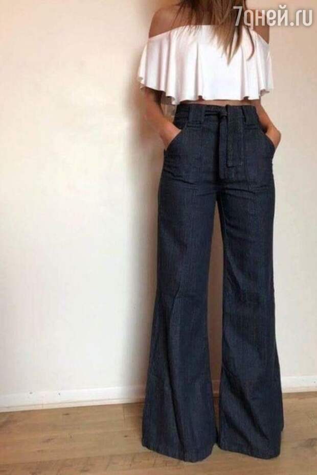 Джинсы-клеш, символ моды 70-х, придают образу очаровательное ретро-настроение. Они визуально удлиняют силуэт, соблазнительно подчеркивают изгиб бедер. Джинсы охотно сочетаются с рубашками разных мастей, футболками и оригинальными сумочками — именно так их носила Джейн Биркин. Бахрома и другие элементы стиля бохо-шик в ансамбле тоже очень и очень приветствуются.
