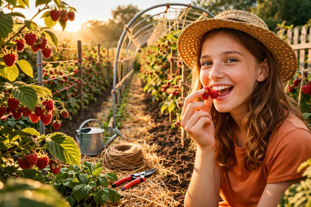 Если вы хотите идеальный порядок на грядке, попробуйте метод «живого плетения». Вдоль ряда вкапываются столбы, между которыми фиксируются две-три горизонтальные жерди. Выбирайте 1–2 самых сильных побега в кусте, и пока они гибкие, их нужно аккуратно оплетать вокруг жердей наподобие забора. В результате малина будет надежно зафиксирована без лишних веревок и завязок, вентиляция на грядке сохранится, а кусты получат максимум света. И сбор урожая при таком подходе превратится в удовольствие.