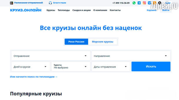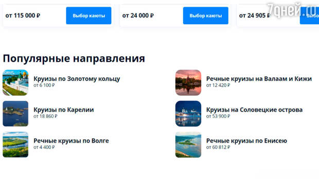 онлайн» можно бронировать речные и морские путешествия по всем популярным направлениям. Наибольшим спросом пользуются круизы из Москвы и Санкт-Петербурга через Валаам, Углич, Кижи, Горицы, Мандроги, Мышкин и Тверь.