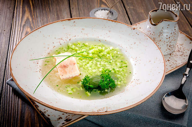 - На тарелку выложить смесь из огурца, зелени и редиса, рядом положить снег из ботвы и редиса, сверху выложить кусочки рыбы и залить квасом.