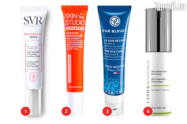 1. Средства от сухости и увлажняющие для кожи век SVR. 2. Крем для сохранения молодости кожи вокруг глаз Skin Studio Stellary. 3. Гель для Контура Глаз с васильком БИО Per Bleuet Yves Rocher. 4. Увлажняющий крем для глаз Ultra moisturiser eye cream Ultraceuticals.