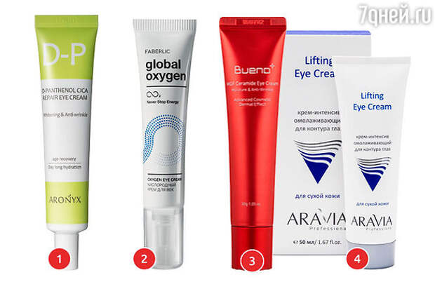 1. Восстанавливающий крем для кожи вокруг глаз с пантенолом и пептидами ARONYX. 2. Кислородный крем для век Global Oxygen Faberlic. 3. Крем для век со стволовыми клетками томата Bueno. 4. Крем интенсивный омолаживающий для сухой кожи глаз Aravia.