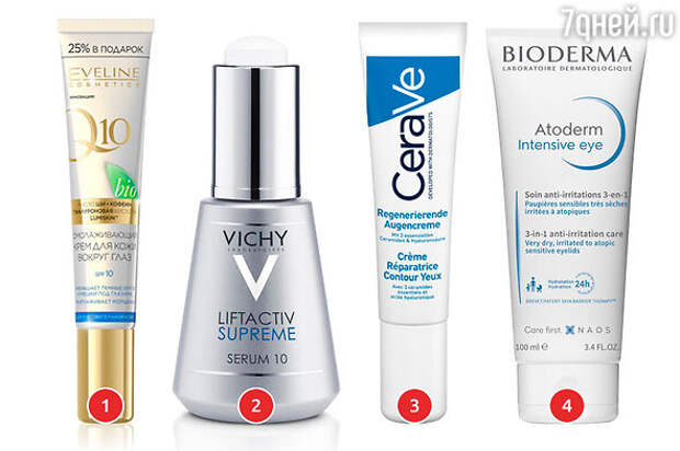 1. Омолаживающий крем для кожи вокруг глаз Q10 Eveline. 2. Интенсивная сыворотка для молодости кожи Liftactiv Supreme Serum 10 Vichy. 3. Восстанавливающий крем для кожи вокруг глаз CeraVe. 4. Интенсивный уход за областью вокруг глаз 3-в-1 Atoderm Bioderma.