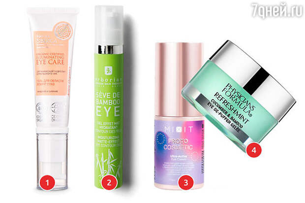1. Гель для кожи вокруг глаз Natura Siberica. 2. Увлажняющий уход за кожей вокруг глаз "Бамбук" Erborian. 3. Укрепляющий крем против морщин Proto Cosmetiс Mixit. 4. Гель для кожи вокруг глаз Refresh Mint Cucumber&Bamboo Eye De-Puffer Gelee Physicians Formula.