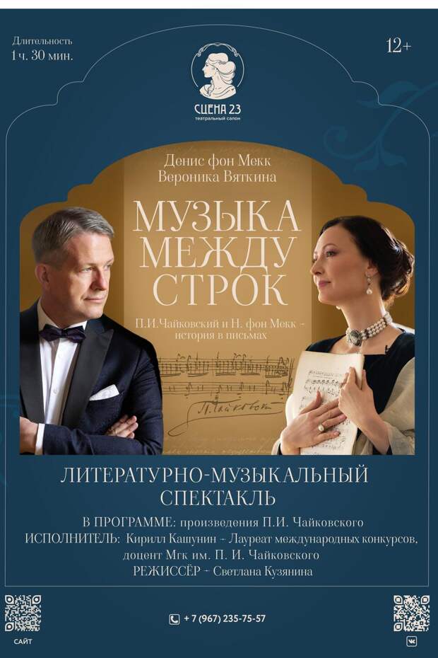 Спектакль-диалог «Музыка между строк», посвященный самому невероятному роману в письмах в истории — переписке Петра Ильича Чайковского и его покровительницы Надежды Филаретовны фон Мекк, покажут 15 января в Рахманиновском зале Московской консерватории. Письма звучат в исполнении актрисы и благотворителя Вероники Вяткиной и Дениса фон Мекк – мецената и потомка известной династии.