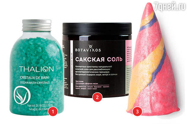 1. Соль для ванны Crestaux de Bail THALION. 2. Сакская соль Botavicos. 3. Пена для ванны "Рог единорога" Lush.