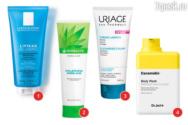 1. Успокаивающий гель для душа с защитными свойствами Lipikar La Rocher-Posay. 2. Гель для душа Herbal Aloe. 3. Очищающий пенящийся крем Cleansing Cream Uriage. 4. Гель для душа Ceramidin Dr.Jart+.