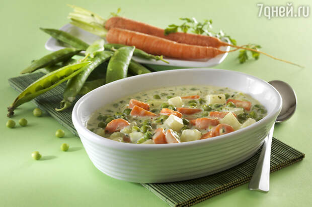 Очищенные морковь, репу и картофель (по 250 г) и 500 г мякоти телятины нарезать кубиками. Мясо обжаривать в 2 ст. л. сливочного масла и 1 ст. л. оливкового масла на сковороде в течение 5 минут, а затем переложить кусочки на тарелку. На сковороду добавить 2 ст. л. сливочного масла, нарезанные кубиками овощи, 200 г зеленой фасоли и 2 толченых зубчика чеснока и 5 минут обжаривать содержимое на слабом огне. Затем вернуть на сковороду мясо, посыпать его 1 ст. л. муки, залить ингредиенты 300 мл мясного бульона и 150 мл сухого белого вина, добавить 100 г замороженного зеленого горошка, лавровый лист и соль-перец по вкусу, перемешать закуску и 40 минут томить на слабом огне, помешивая.