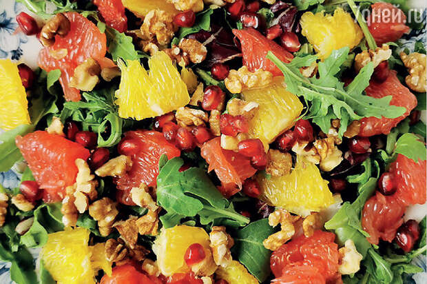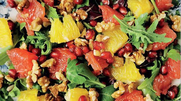 Праздничный салат с грейпфрутом, апельсином, руколой и грецкими орехами, который идеально вписывается в любое зимнее мероприятие. И на новогоднем столе будет отлично смотреться!