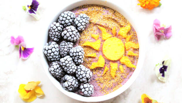 - Украсьте смузи замороженной ежевикой и «солнцем» из манго.