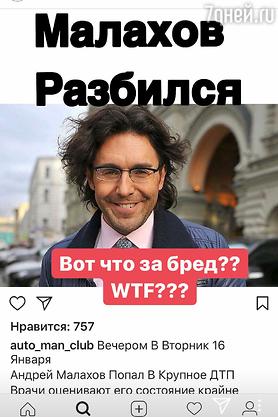 На днях в соцсетях распространилась новость о страшной аварии. Якобы одним из водителей, попавшим в крупное ДТП стал Андрей Малахов. Сообщалось, что врачи оценивают состояние телеведущего, как «крайне тяжелое».