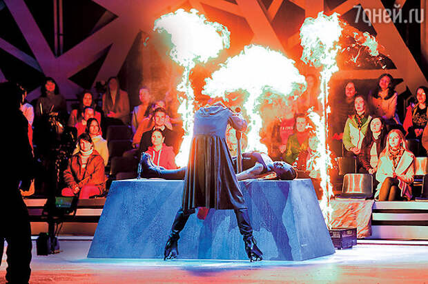 Но я отношусь с пониманием, они же актрисы. С фигуристами проще, мы с ними работаем уже 14 лет, они знают все особенности жанра. А девушки-актрисы привыкли к громоздким театральным нарядам и не всегда сразу понимают, что на льду в них работать не получится. Сначала упрямятся, потом пробуют выйти на каток в том, что им нравится, видят, что это неудобно, и мы возвращаемся к тому, с чего начали. Так что мы тут никого не мучаем!» Хотя элементы «пыток» бывают. Например, Владимир Маркони в одном номере должен был гореть — в прямом смысле, в огне. Для того чтобы все остались живы и здоровы, у пиротехников заказали специальную огнеупорную ткань, сшили костюм, в котором он и полыхал. Такой вот на съемках лед и пламень.