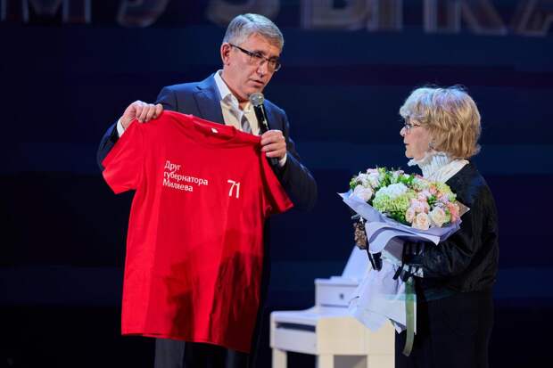 А еще глава региона вручил футболку «Друг губернатора». А взамен получил от креативной Аллы Ильиничны майку с надписью «Самый музыкальный губернатор», где его фамилию разложили на ноты – «МИ-ЛЯ-ев». Тут же Дмитрий Миляев доказал это на деле — поздравил режиссера с прошедшим днем рождения песней крокодила Гены.