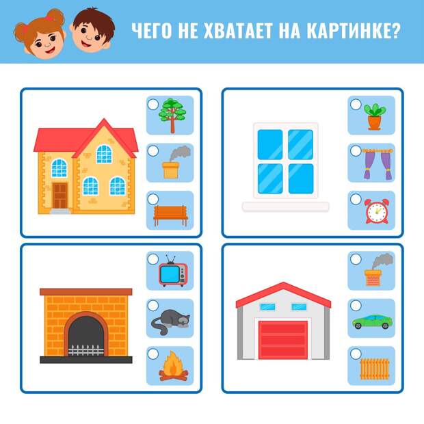 Сложность изображений можно выбирать разную и постепенно ее повышать, но начать все-таки лучше с простых картинок, где малышам будет нетрудно определить недостающие компоненты.Предложите ребенку рассмотреть картинки. Его задача — заметить допущенный недочет и выбрать из предложенных вариантов, чего не хватает на изображении.