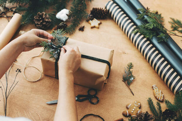 Используйте то, что дает природа: мешковину, льняную ткань, крафт-бумагу. Украсьте подарок живой зеленью (еловыми или сосновыми веточками), шишками, деревянными подвесками.