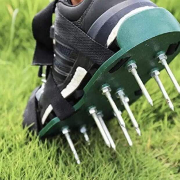 Газон выглядит уставшим, трава растет плохо или после дождя образуются лужи? Все это признаки уплотненной почвы. Аэрация насыщает землю кислородом, улучшает проникновение влаги и питательных веществ к корням. Самый простой вариант — сандалии с шипами: надеваются поверх обуви, ходите по газону, а шипы прокалывают дерн.