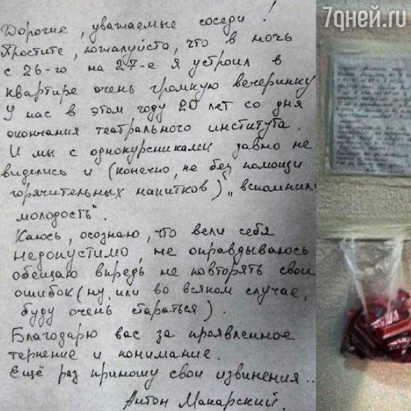 «Дорогие, уважаемые соседи! — говорилось в ней. — Простите, пожалуйста, что в ночь с 26 на 27 сентября я устроил в квартире очень громкую вечеринку! У нас в этом году 20-летие со дня окончания театрального института. И мы с однокурсниками давно не виделись и (конечно, не без помощи горячительных напитков) «вспомнили молодость». Каюсь, осознаю, что вели себя недопустимо, не оправдываюсь, обещаю впредь не повторить своих ошибок (ну, или во всяком случае буду очень стараться). Благодарю вас за проявленное терпение и понимание. Еще раз приношу свои извинения... Антон Макарский».