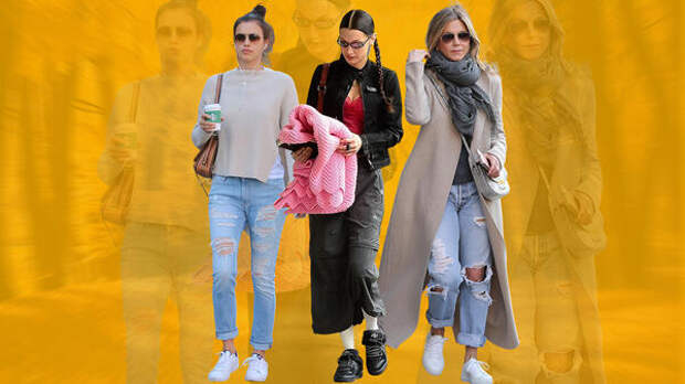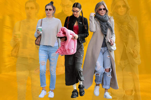 Классика осени как у Дженинифер Энистон. Голубые джинсы + белые сникеры + пальто