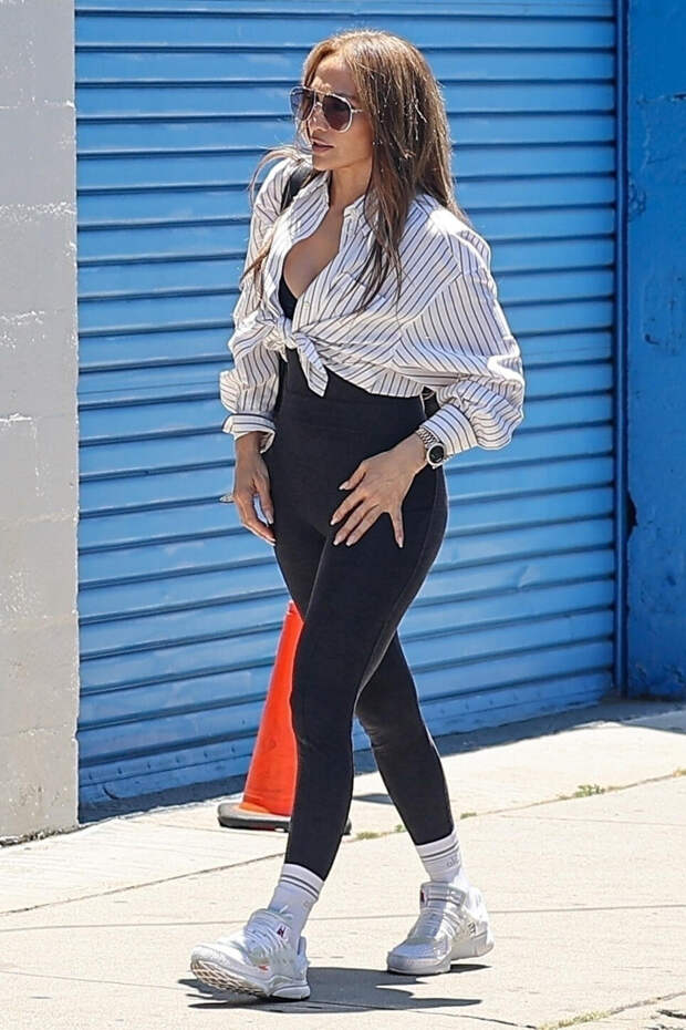 В стиле спорт-шик как у Дженнифер Лопес. Белые сникеры + черные леггинсы + рубашка в полоску