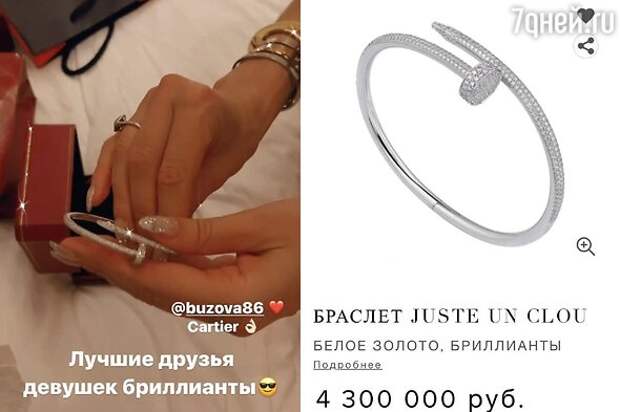 Украшение фирмы Cartier сделано из золота и инкрустировано россыпью бриллиантов. Стоит такое чудо 4,3 миллиона рублей, так что теперь на руке у певицы красуется браслет по цене «однушки» в Москве.К слову, в августе Дава уже дарил Бузовой браслет от Cartier. Но тогда цена украшения была несколько скромнее – 3,5 миллиона рублей, но в дополнение к нему блогер преподнес артистке пару сережек.