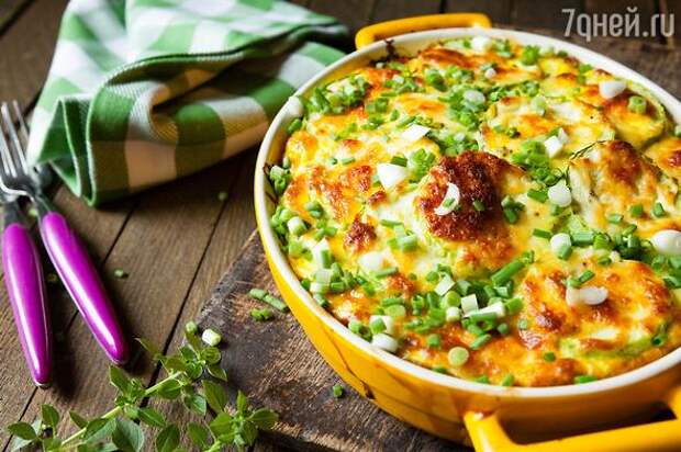 «Мелко нарезать очищенный репчатый лук (1 шт.), чеснок (2 зубчика). Порезать картофель, помидор, цукини, кабачок (все по 1 шт.), а затем спассеровать их на оливковом масле (1 ст. л.) в течение 5 минут. Овощи должны стать полупрозрачными. Посуду для запекания смазать оливковым маслом.