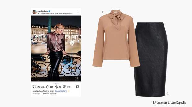 Красавица Кейт поделилась образом не на каждый день. Шелковая переливающаяся блуза коричневого оттенка отлично сочетается с кожаной юбкой. Игра фактур и цветов — очень эффектно. Чтобы не перегружать образ, Кейт выбрала лаконичный пучок — смотрится изысканно. Отличный вариант для любого мероприятия — от дня рождения до корпоратива.