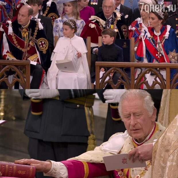 Шарлотта отвлекла на себя внимание журналистов и гостей церемонии, но ненадолго. Позже Карл принес клятву и был официально коронован. Глава Церкви Англии архиепископ Кентерберийский Джастин Уэлби возложил на голову суверена корону святого Эдуарда Исповедника.