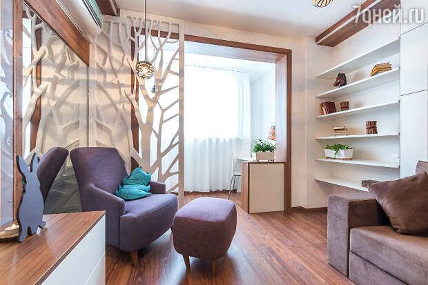 - Лоджию от центральной части отделили резной перегородкой,напоминающей дерево.