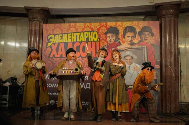 Так называемыми «виртуозами Лондона» и «сливками лондонского дна» оказались артисты популярной музыкальной комедии «Элементарно, Хадсон! Дело о собаке Б.» — веселой хулиганской версии знаменитой «Собаки Баскервилей». В эти дни постановка театральной компании «Бродвей Москва» отмечает свой первый год проката в театре «Маска» в МДМ. Появление артистов шоу в метро оказалось возможным благодаря проекту «Музыка в метро».