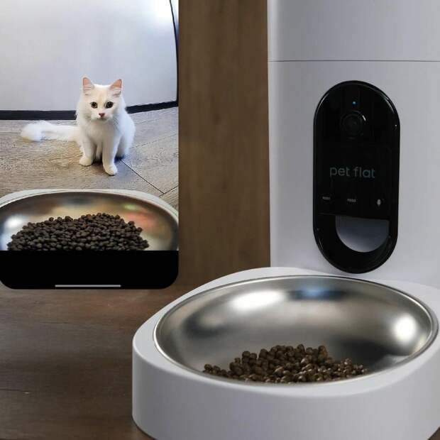 Кормит кота или собаку строго по расписанию даже в ваше отсутствие: встроенная камера позволяет видеть питомца в реальном времени и общаться с ним через динамик. Порции дозируются автоматически — полезно для животных на диете. Контейнер вмещает запас корма на несколько дней. Получайте уведомления о каждом кормлении и отслеживайте, сколько съел питомец.
