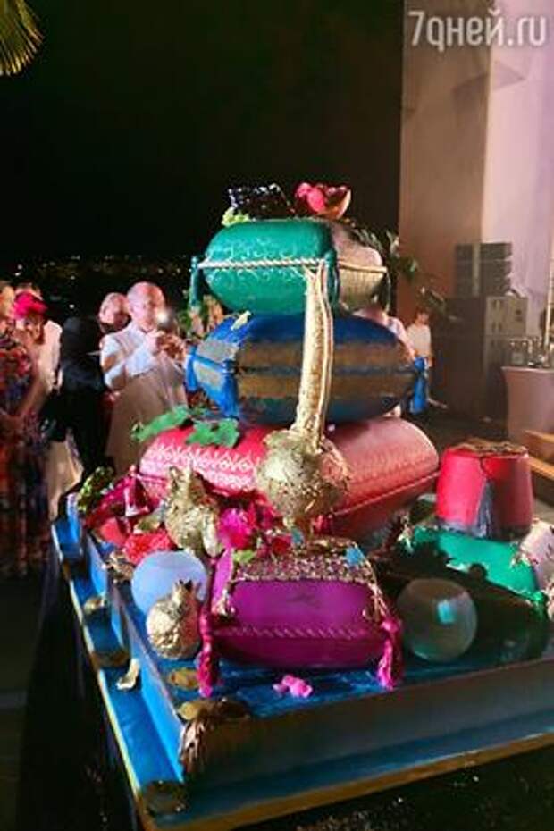 А незадолго до этого Игорь Яковлевич задул свечи на именинном торте, выполненным в восточном стиле. То, что это десерт, кстати, все догадались не сразу. Сложенные друг на друга декоративные подушки, украшенные виноградом и сладостями, из которых были построены ярусы торта, выглядели очень реалистично.