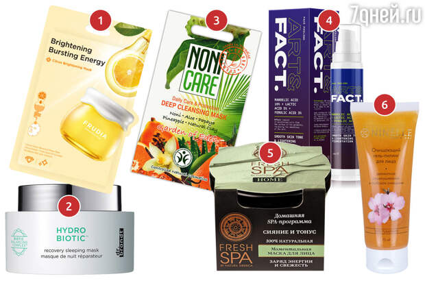 1. Тканевая маска для лица Citrus Brightening Mask Frudia. 2. Ночная маска Hydro Biotic dr brandt. 3. Глиняная маска для глубокого очищения Deep Cleansing Mask Noni Care. 4. Всесезонный пилинг-эксфолиант для лица Art&Fact. 5. Моментальная маска для лица "Сияние и тонус" Natura Siberica Fresh SPA home. 6. Очищающий гель-пилинг Ninelle.