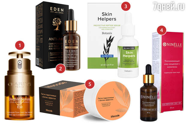 1. Комплексная омолаживающая двойная сыворотка для области вокруг глаз Double Serum Eye Clarins. 2. Сыворотка для лица восстанавливающая с пептидами и гиалуроновой кислотой Eden. 3. Пептидная сыворотка-протектор Skin Helpers. 4. Разглаживающий кожу концентрат с коллагеном Ninelle. 5. Патчи гидрогелевые для кожи вокруг глаз от морщин Lifecode.