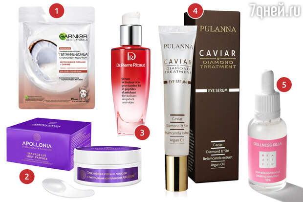 1. Тканевая маска-молочко "Питание Бомба" с кокосовым молочком Garnier Skin Naturals. 2. Спа лифтинг-патчи с лотосом APOLLONIA. 3. Сыворотка-активатор липидовосполняющая против морщин Dr. Pierre Ricaud. 4. Восстанавливающая лифтинг-сыворотка для глаз Caviar Pulanna. 5. Пилинг всесезонный для мягкого обновления и идеального тона Dullness Killa Beautific.